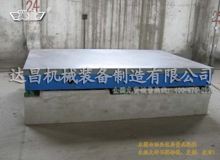 一般鑄鐵平臺的調平都是采用方型的調整墊鐵,根據平臺的重量及使用來確定所需墊鐵的規格。如一塊2000*4000的鑄鐵平臺,一般至少需要用到六塊墊鐵,墊在鑄鐵平臺的四角及4米方向兩側的中間位置,鑄鐵平臺及工件重量一共為5T的重量時,至少要選用規格為200*100*60的S83型調整墊鐵,當然大于此規的墊鐵也是可以的。具體調平方法為:吊裝平臺,把六塊墊鐵放置好,裝鑄鐵平臺放置在墊鐵上,調整墊鐵,使各墊鐵均勻胎受力,用水平測量儀器(水平尺或電子水平儀)檢測鑄鐵平臺水平狀況,調整墊鐵上面的螺栓,直到符合水平位置。初次調平后,需靜置12小時,然后再次檢測,如不合格需進行再次調整,合格后方可使用。鑄鐵平臺需要根據使用情況定制進行維護,一般維護周期為6-12個月。