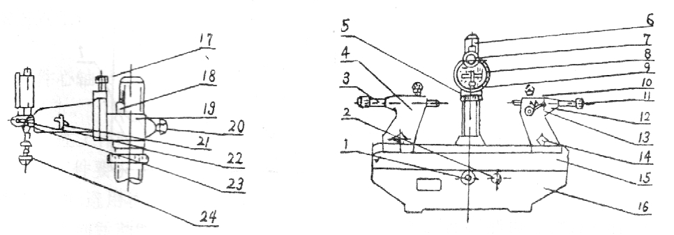 1.膠木手柄 2.膠木螺帽 3.頂針 4.左頂針架 5.升降螺帽 6.立柱 7.千分表 8.測(cè)量支架 9.測(cè)量頭 10.膠木螺釘 11.M4膠木螺釘 12.右頂針架 13.手柄 14.膠木螺帽 15.臺(tái)面 16.底座 17.緊固螺釘 18.指標(biāo)塊 19.測(cè)量座 20.膠木螺釘 21.手柄 22.螺釘 23.表架 24.接頭